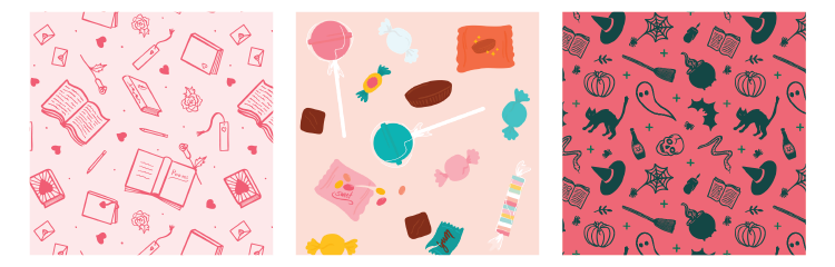 I then realized how much I loved creating art with every day items in a fun, playful way. Since then, my favorite patterns have included a Romantic Poetry pattern, a Candy Loot pattern, Spooky Vibes, Donuts, Floral Cats and Motel Signs!